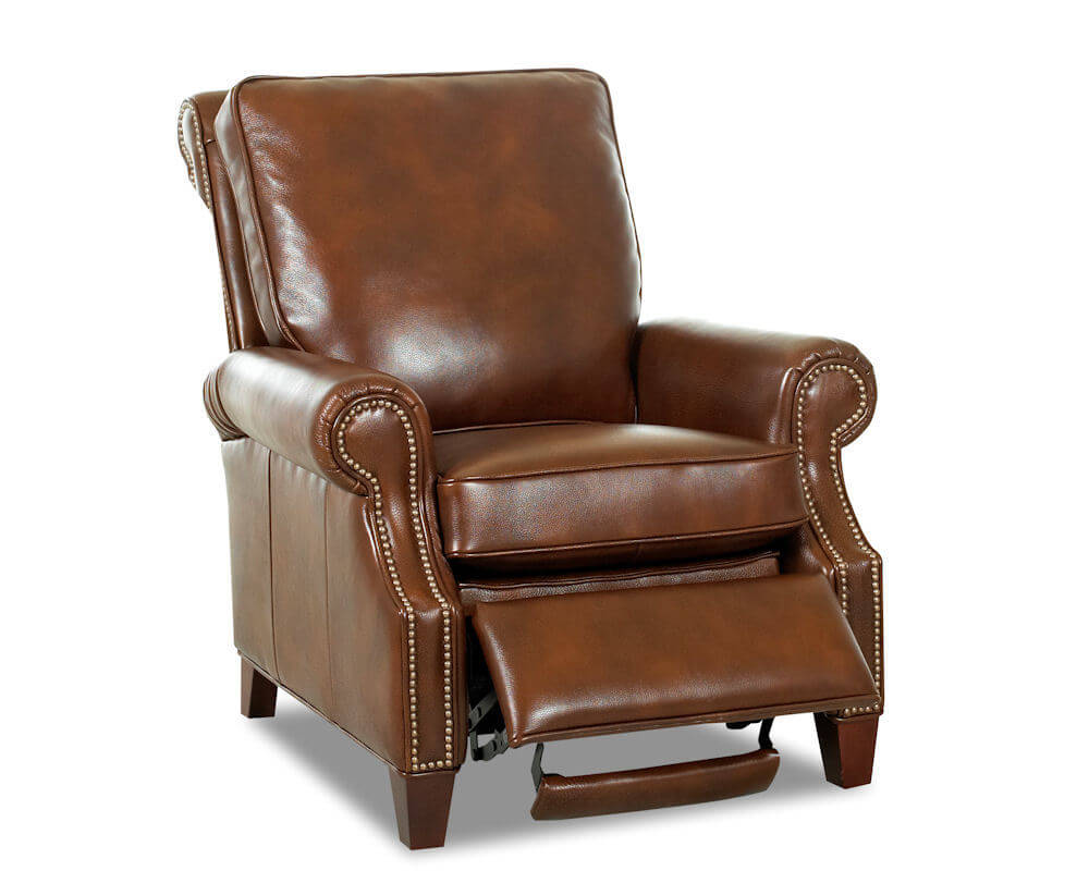 The Adams leather recliner is rated one of America’s best leather recliners in terms of comfort, quality and durability. The design has clean traditional lines. The large back cushion provides support and comfort. The comfortable seat cushion is a blend of waterfowl down feathers plus synthetic down like fibers inserted into a channeled wrap that surrounds the high density and high resiliency foam core. This seat cushion provides years of support and comfort. The same seat cushion is also available without down feathers for those who want a cushion to hold its shape better. This leather recliner includes a loose seat cushion and an attached back. Optional contrasting leather welt is also available to make this chair uniquely yours. When reclined, the fold out ottoman includes a hidden extension that provides added ankle and foot support, especially for the taller person. The arms on the recliner have a traditional rolled style with a recessed sculpted front face. The individually hand applied nail trim comes in your choice of nail head colors to compliment your leather selection. The hardwood legs are finished in a nice Mahogany or Merlot color. To activate the leather recliner simply press back on the arm rests. This leather recliner provides comfortable reclining positions. An optional power assist reclining mechanism is available with or without a rechargeable battery back up. Personalize your recliner with your choice of leather color as there are 120 leather color choices, all are top grain premium select leather cow hides. These selections, features and benefits make the Adams recliner one of the best leather recliners in America.