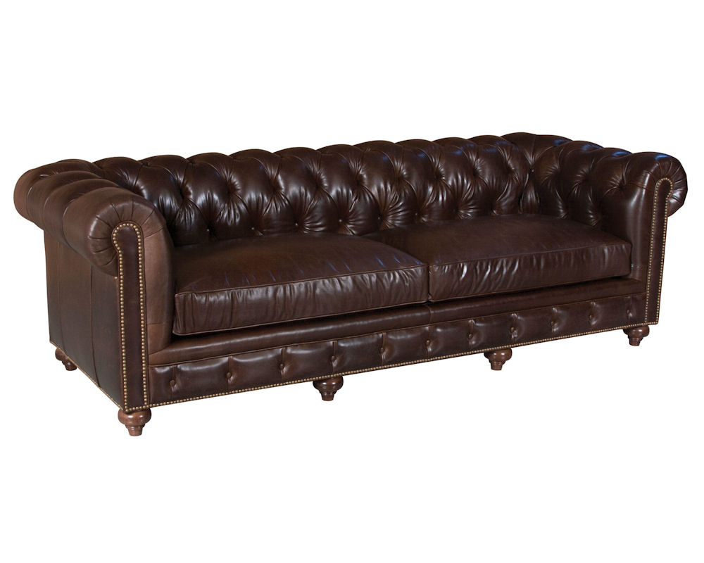The Classic Leather Hemingway Sofa has the traditional Chesterfield styling. Styling includes same height arms and back with deep button tufting, including along the front base, plus nail trim on the arm fronts and along the base and hardwood sculpted feet. You can make this beautifully yours with your choice of leather color, nail trim, and wood finish.