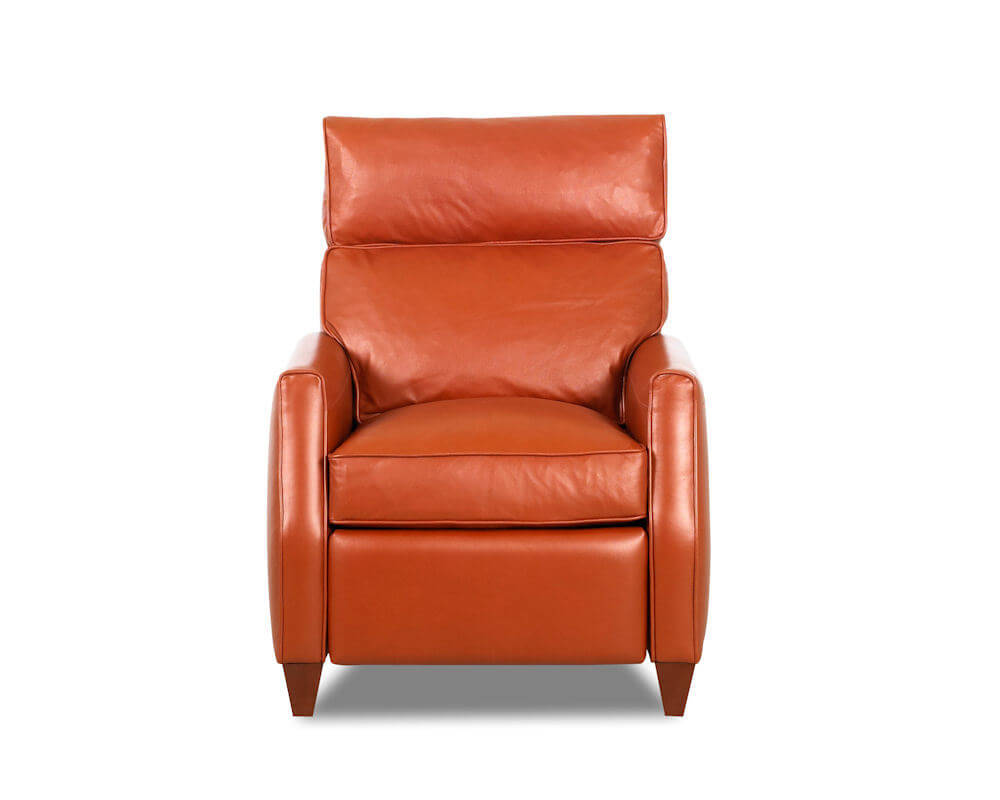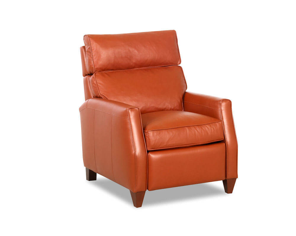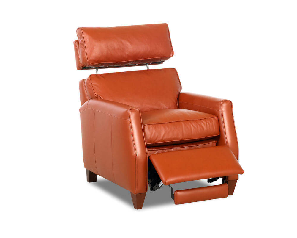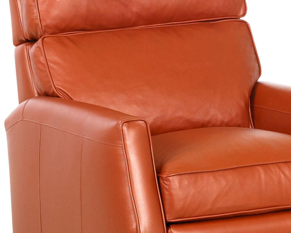 The Collins is both comfortable and durable. The pop-up head rests adds extra support for the head. Also, a hidden additional foot rest extension becomes available once reclined, providing additional ankle and foot support. Simply push on the arms to activate the recliner mechanism and then relax in comfort. Sink into the wide Down Feather Blend back rest cushion. The zippered and loose seat cuchion is made with a high density, high resiliency foam core that is wrapped in a blend of waterfowl down feathers plus synthetic fibers providing both support and relaxing comfort. A hand rubbed Black Walnut wood finish is applied to the hardwood legs. A power recliner is optional as well as a swivel reclining mechanism with a round black base. Choose from 120 top grain leather aniline dyed color options. The Collins recliners are handmade in North Carolina.