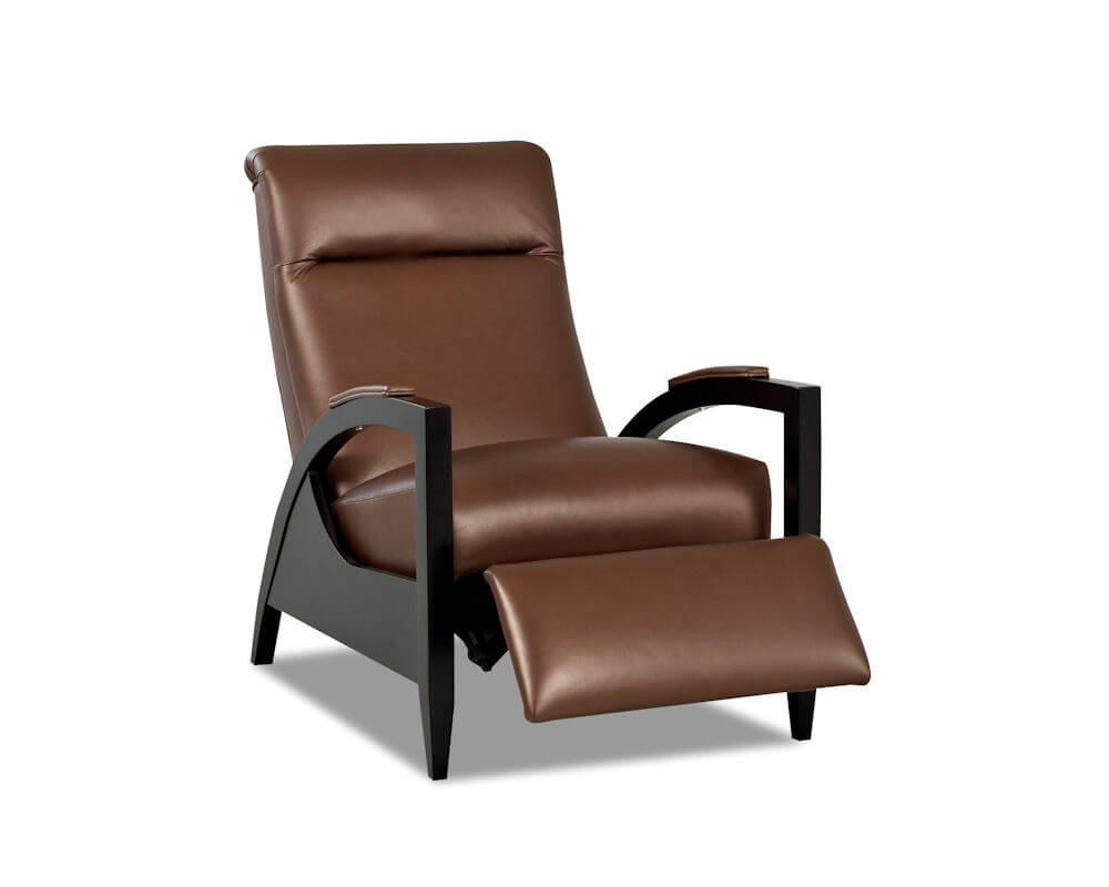 The Comfort Design Wynward Recliner has a unique design and does not look like a recliner. This leather recliner has a narrow appearance but has deceivingly wide and plush seat at 25″ wide. The seat has the popular Posture Plush seat cushion for consistent comfort. The backrest provides for both back and head support and includes a slight top roll style element. The armrests include a top leather pad. The hardwood arms and legs come in a hand rubbed Espresso wood finish. The extended footrest provides ample support. A simple push on the arm activates the recliner. Select from 120 leather colors, all premium quality top gain leather cow hides. Handmade with American quality ensures that the Wynwood recliner will look great and last many years.