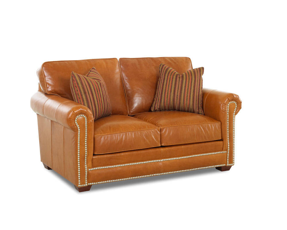 The Daniels collection includes beautiful Comfort Design Daniels Loveseat as pictured above (shown in Masterpiece Craft leather). This leather loveseat includes traditional rounded arms, loose back cushions, feather or foam seat cushions, with or without nail trim, and square wooden feet. It is made by Comfort Design of North Carolina which makes only high quality made to order leather furniture. Hundreds of top grain leather colors to choose from, plus a choice of mahogany or merlot on the wood feet. Available with matching sofa, loveseat, chair and ottoman.