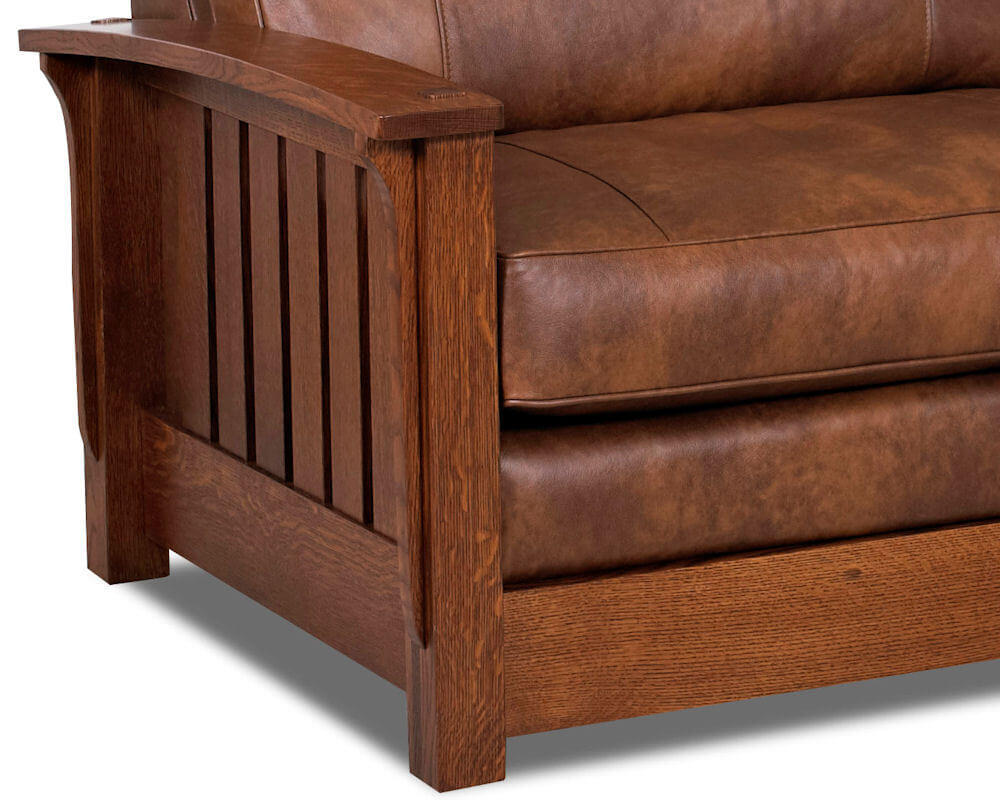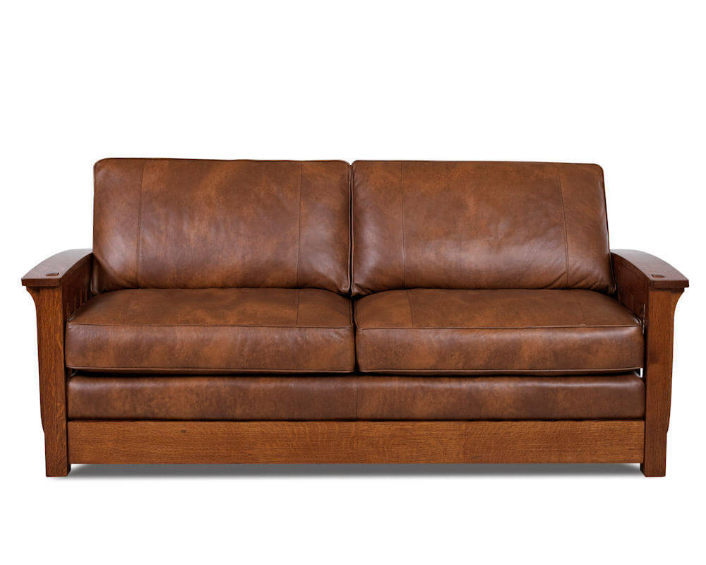 his sofa is also availabe as a Queen size American made leather sleeper sofa. Matching items incldue sofa, sleeper, chair and recliner. This sofa is made to your order in North Carolina by Comfort Design. The thick quarter sawn solid Oak wood on the arms and legs make this a very handsome piece of furniture. The wood is hand sanded smooth to allow the wood grain to show through. The wood is finished in a Rustic Oak color. The attached plush backrest provides plenty of comfortable support. The welted and loose seat cushions are available in a Down Blend or Posture Plush cushion, see above. Select from over 120 top grain leather cow hides. This attractive and comfortable Palmer leather sofa is made to last a lifetime.